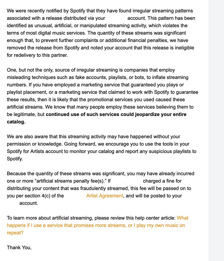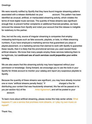 Here's the actual letter from my distributor, with their name redacted as I still use them. I should point out that NONE of the independent non-major label distributors would have fought for me against Spotify regardless of my innocence. Changing distributor would do nothing.